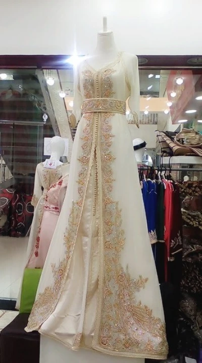 قفطان جديد ملبوس مرة فقط لون blanc cassé مخدوم من قدام و من اللور طبق الحنة و السلة جدد مستعمل مرة فقط سعرهم �