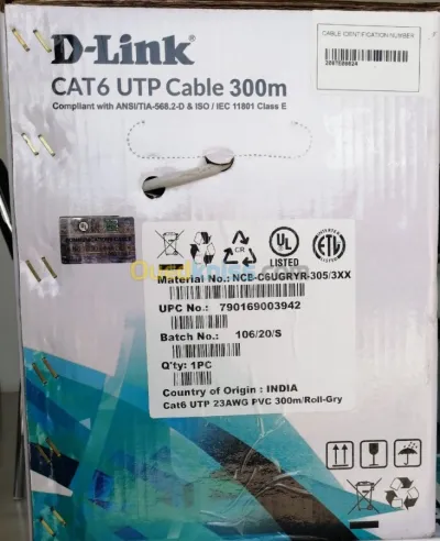 Dlink CAT 6 UTP Cable Reseau Cat 6 UTP bobine de 305m de marque D-link NCB-C6UGRYR-305-23 CAT6 UTP 23AWG · 4 Pairs Unshielded Twisted Pair (UTP) Cable. certifié, pour réseaux téléph