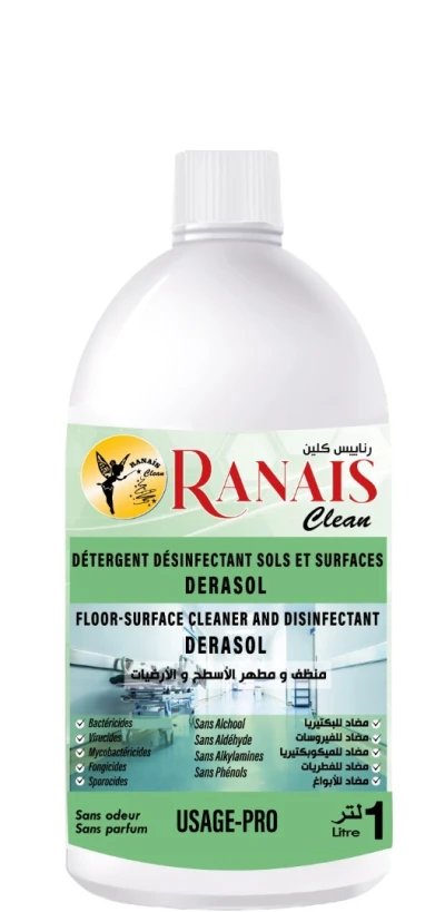 NETTOYANT ET DESINFECTANT SOLS-SURFACES DERASOL Le DERASOL est un désinfectant moussant prêt à l'emploi pour les sols et les surfaces, Il contient des tensio-actifs qui permettent de nett