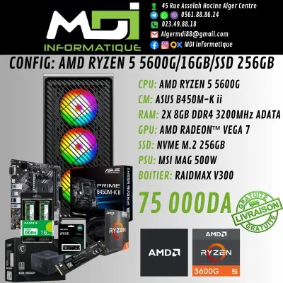 CPU: AMD RYZEN 5 5600G CM: ASUS B450M-K ii RAM: 2X 8GB DDR4 3200MHz ADATA GPU: AMD RADEON™ VEGA 7 SSD: NVME M.2 256GB PSU: MSI MAG 500W BOITIER: RAIDMAX V300
