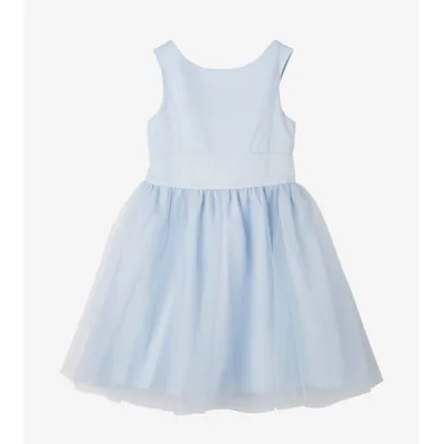 Douceur et élégance avec cette jolie robe de cérémonie bleu dans l'esprit tutu avec des voiles et jupon en tulle et un joli décolleté au dos en forme V, souligné d'un joli nœud. Des