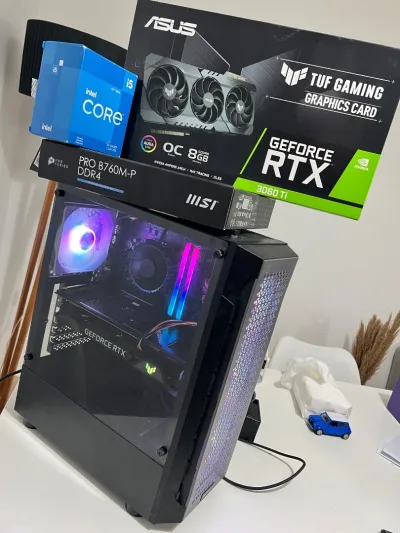 ✅Carte mère : Pro b760m_p ddr 4 ✅Cpu : intel I-5 12400F ✅GPU : RTX 3060 TI Asus TUF 3 trio ✅Ram : asgard RGB (8x2) 16 ddr 4 3200mhz ✅Ssd 256 Samsung NVME ✅Pcu : 650w thermalt