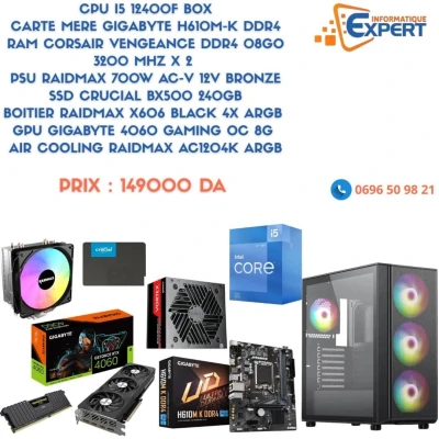 CPU I5 12400F BOX CARTE MERE GIGABYTE H610M-K DDR4 RAM CORSAIR VENGEANCE DDR4 08GO 3200 MHZ X 2 PSU RAIDMAX 700W AC-V 12V BRONZE SSD CRUCIAL BX500 240GB BOITIER RAIDMAX X606 BLACK 4X ARGB