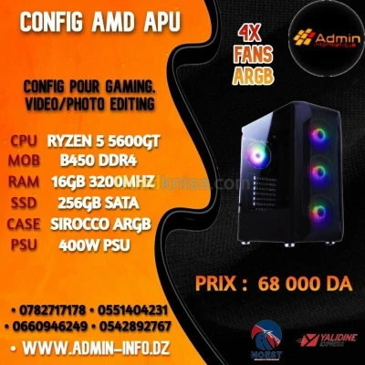✅INFORMATIONS GÉNÉRALES : ✅Désignation : CONFIG AMD APU - RYZEN 5 5600GT - B450 DDR4 - 16G - 256GB SSD - 400 W - SIROCCO ARGB 4 FANS - BLACK 💻 CONFIGURATION GAMING – PUISSANCE