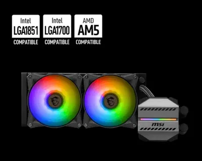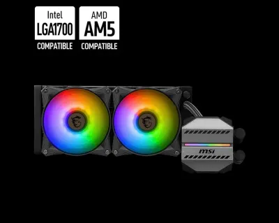 Le système de refroidissement liquide MSI MAG CORELIQUID M240 est un kit tout-en-un de 240 mm avec un radiateur performant et deux ventilateurs ARGB de 120 mm, offrant une dissipation therm