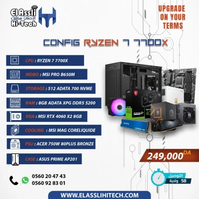 LA CONFIGURATION RYZEN 7 7700X est dotée d’un processeur AMD Ryzen 7 7700X, d’une RAM ADATA XPG Lancer 8GB DDR5 5200MHz, d’un disque SSD NVMe ADATA Legend 700 Gen3 512GB, d’une cart