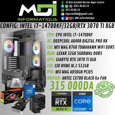 CPU: CPU INTEL i7-14700KF AC: DEEPCOOL AK400 DIGITAL PRO BK CM: MSI MAG B760 TOMAHAWK WIFI DDR5 RAM: LEXAR 32GB 5600MHz DDR5 GPU: GIABYTE RTX 3070 TI 8GB SSD: SSD NVME M.2 512GB PSU: MSI MA