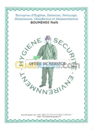 Entreprise d'hygiene & entretien, nettoyage desinfection desinsectisation & deratisation Siege social : 86 logts n° 21 Sidi Benyebka Arzew Oran site espaceboumehdi.e-monsite.com