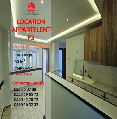 A LOUER: APPARTEMENT F3 - 1ER - 60M² - CHERAGA CENTRE VILLE. Cheraga, centre-ville, dans une résidence gardée 24h/24, Casa Immo met en location un appartement F3 aménagé en cabinet mé