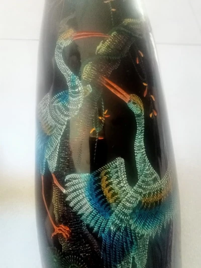 vase en nacre noir motif et graphisme oiseaux année 1960/1970 belle brillance très propre très bon état général très bon qualité vase en nacre très rare venu de France hauteur 35cm