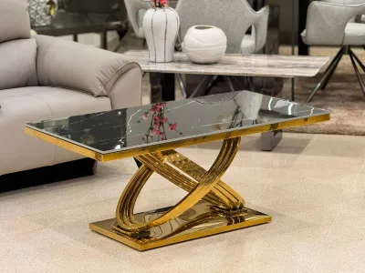 ✨ Apportez une touche de luxe à votre salon avec cette table basse au design moderne et raffiné ! Son plateau en verre noir marbré s'associe parfaitement à sa structure dorée aux cour