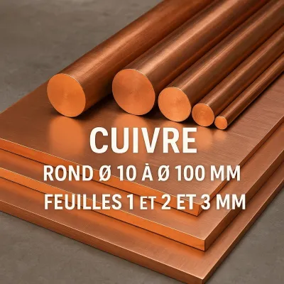 Disponible à la vente : Barres de cuivre rond plein, haute qualité, diamètre de 10 mm jusqu'à 100 mm Feuilles de cuivre en différentes épaisseurs : 1 mm, 2 mm, 3 mm Applications :