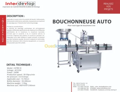 SARL INTERDEVLOP vous propose une BOUCHONNEUSE AUTOMATIQUE petit modèle Détailles Techniques: 1. Tension: 220V 50 / 60Hz 2. Diamètre du capuchon: 30-60mm 3. Hauteur de la bouteille: