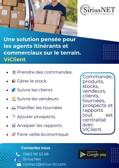 🚀 Simplifiez la gestion de votre activité commerciale avec ViClient ! Avec une seule application, vous pouvez : ✅ Prendre et suivre vos commandes ✅ Gérer votre stock en temps réel