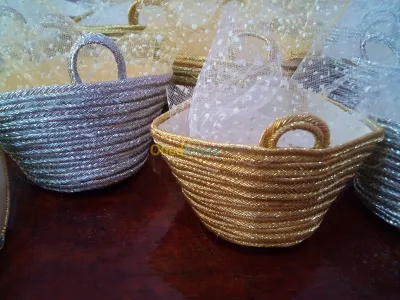 Je met en vente des petits paniers à dragées fait mains pour vos fêtes à des prix raisonnable avec plusieurs couleurs à 45 DA vides et à 65 DA avec dentelles et dragées