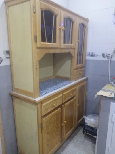 Buffet+deux éléments de cuisine en bon état, bois rouge.