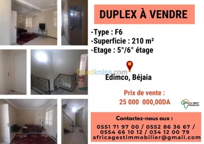 L'agence BEJAIA IMMOBILIER met en vente un spacieux appartement (duplex) de type f6 sis a la cité somacob, une cité résidentiel au centre ville de Béjaïa proches des administrations, é