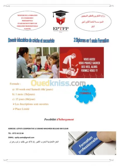 Offres de formations Formation Educatrice de Crèches Inscriptions Ouvertes Durée : 5 jours + 01 Mois de Stage Niveau d'accès: 4AM et Plus Frais de Formation: 15 000 da (Possi