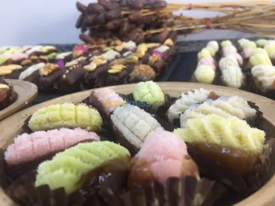 Confiserie 100% Artisanale , spécialisée dans : La pâte de fruits Halkoum/loukoum Fruits confits Fruits fourrés Dattes fourrées Chocolat fourrés