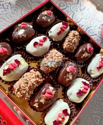 Je propose de délicieuses dattes fourrées aux amandes, décorées avec fruits secs et chocolat, préparées avec soin pour ravir les yeux et le palais. Prix : 100 DA la pièce. Parfaites