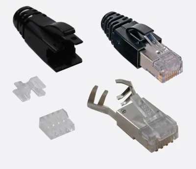 🔹 Connecteurs RJ45 – Cat5e / Cat6A 🛠️ Caractéristiques : Connecteurs RJ45 FTP/STP blindés pour câbles réseau. Compatibles avec conducteurs 24-23 AWG. Finition plaqué or pou