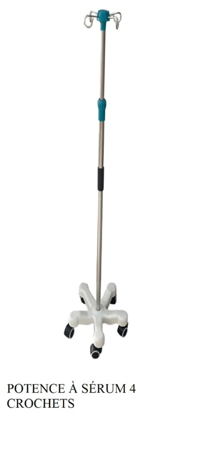 Pied à sérum • Fabriquée en tube d’acier rond • Tige à sérum de 4 crochets • Châssis en acier avec 4 roues • Réglable en hauteur