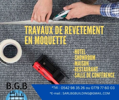 Tout travaux de revêtement de sol en moquette en rouleau ou en dalle avec couleurs et épaisseur sur mesure. BOUDRARENE GENERAL BUILDING EST UNE EQUIPE DE SPECIALISTES DES METIERS DU BATI