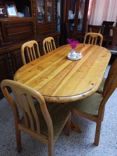 Dimensions : Longueur : 180 cm Largeur : 86cm Superbe table à manger en bois naturel, robuste et élégante. Forme ovale, idéale pour les repas en famille ou entre amis. Les 6 chaises asso