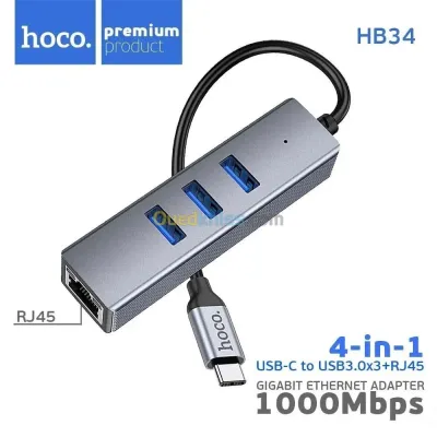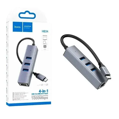 L'adaptateur réseau Gigabit HOCO HB34 Type-C (Type-C vers USB 3.0*3 + RJ45 ) est un adaptateur compact qui vous permet d'étendre rapidement et facilement les fonctionnalités de votre appa
