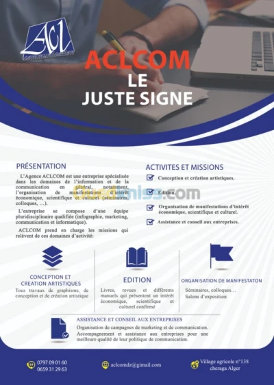 L’Agence ACLCOM est une entreprise spécialisée dans les domaines de l’information et de la communication en général, notamment, l’organisation de manifestation d’intérêt écono