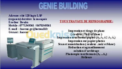 Pour bureaux d'études , prometteurs , entreprises , étudiants; Tirage de plan , Impression et copie A0,A1,A2........ ( couleur et noir et blanc) touts types de formats et de papiers , Num