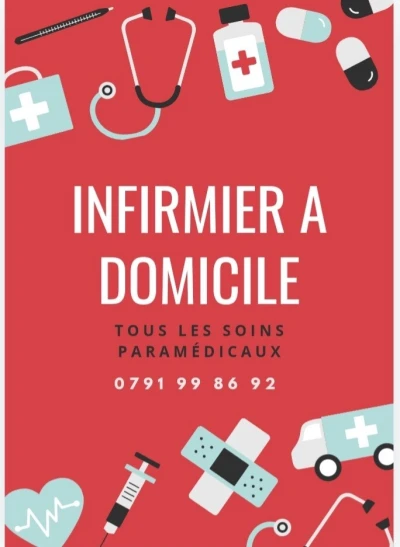 Infermier avec expérience assurent le déplacement à domicile 24h/24h 1- Perfusion avec mon matériel 2- Changement de pansement avec mon matériel 3- Prélèvement 4- Ablation de fi