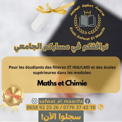 Pour les étudiants des filières ST ING/LMD et des écoles supérieures dans les modules: Maths et Chimie Pour les inscriptions contactez-nous aux numéros affichés sur l'annonce