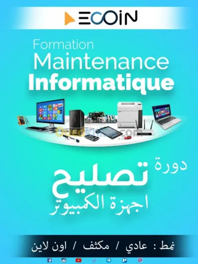 L'école ECOIN vous propose des formations en e-learning dans plusieurs spécialités: Formation Bureautique: Word: 12H Excel: 12H Tarif: 10000 DA Formation Infographie: