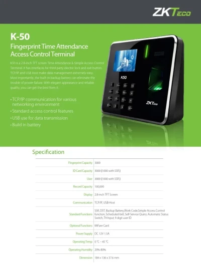 ZKTeco K50 est un terminal de Pointage biométrique IP élégant et innovant conçu pour gérer l'assistance aux employés. Equipé d'une batterie de secours pour continuer à fonctionner en