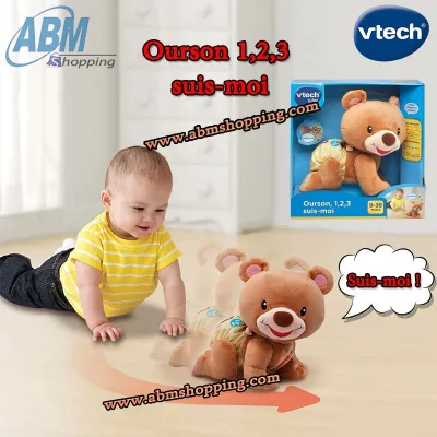 Ourson 1,2,3 suis-moi VTECH – Age minimum : 9 mois Dimensions du produit : (L x l x h) 16.5 x 27 x 26.5 cm Détails & caractéristiques: Cet ourson se met à marcher à quatre pattes e