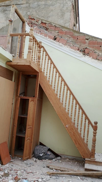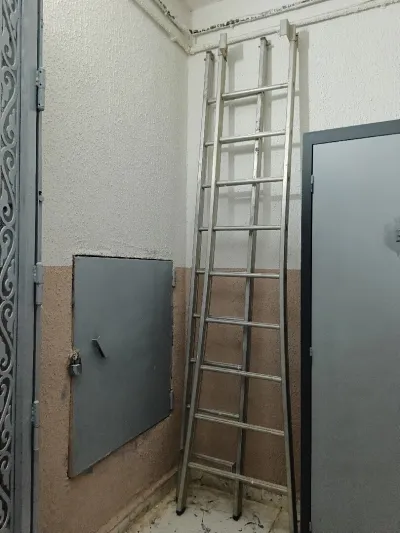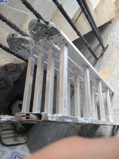 سلم خشبي في حالة ممتازة ( يحتاج الى تنظيف بحكم الأشغال فقط) الارتفاع 2.90م عرض السلم 75سم يحتوي على خزانة أسف