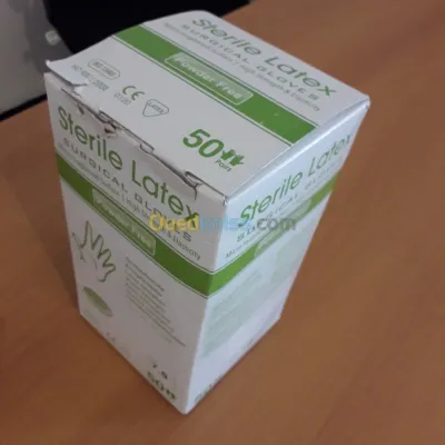 Gants latex chirurgicaux stérile sans poudre Origine : Malaisie Taille disponible : 8'' 7,5'' et 7'' Date de péremption : Mars 2024 Emballage : Boite de 50 pièces Carton de