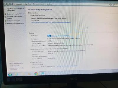 ⚙️ Processeur : Intel Pentium Dual CPU E2180 @ 2.00 GHz (2 cœurs) 💾 RAM : 1 Go 💽 Stockage : Disque dur 160 Go (C: 51 Go / D: 97 Go) 🪟 Système : Windows 7 Professionnel 32 bits