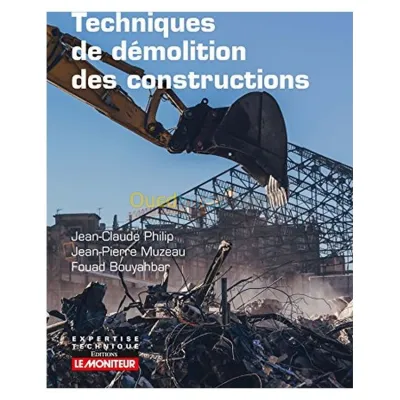 Titre : Techniques de démolition des constructions Auteur : Fouad Bouyahbar Editeur : Le Moniteur Année : 2018 Théme : Sciences De L'Ingénieur Sous-théme : Génie Civil Btp ISBN : 97822