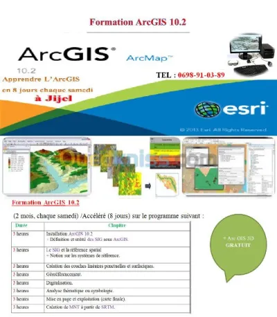 Ecole agréée par l'état, Lance une formation pratique sur logiciel ArcGIS 10.2 , pendant 2 mois chaque samedi ou accélerérée 8 jours , prix CHOC :7000 DA C TT L'hébergement dis