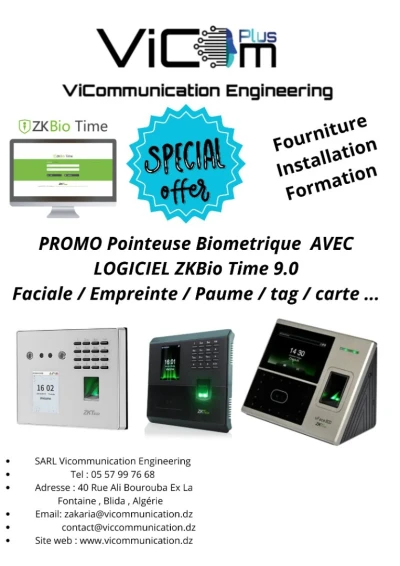 pointeuse biométrique ZKTeco empreinte digitale , Faciale ( visage ) , carte , tag , paume de la main .. etc. , prix très intéressant fourniture , installation et formation software &