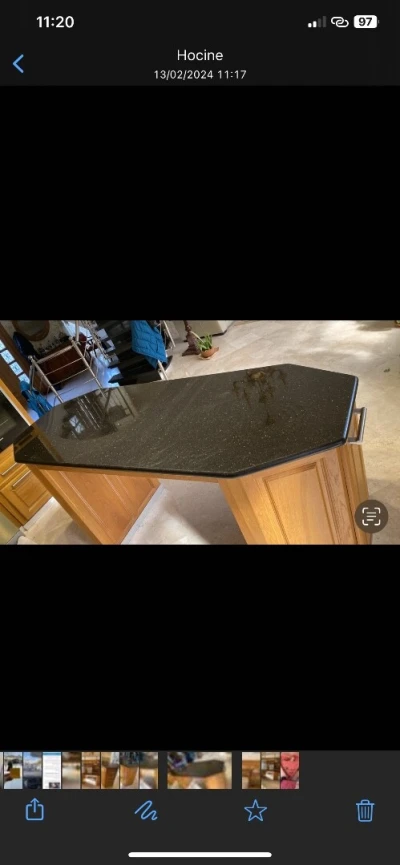 Je mets en vente un très jolie comptoir avec son plafonnier en chêne et granite galaxy noir épaisseur 3cm d une longueur de 2.10 et largeur de 78 cm et d une haute d un 1m.