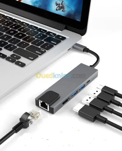 ADAPTATEUR TYPE-C 8 IN 1 RJ45+TF/SD+HDTV+USBx2+PD+TYPE-C • Matériel : Coque en alliage d’aluminium. • Conducteur : 30awg cuivre Étamé • Type d’interface : USB 3.1 • Débit : 5