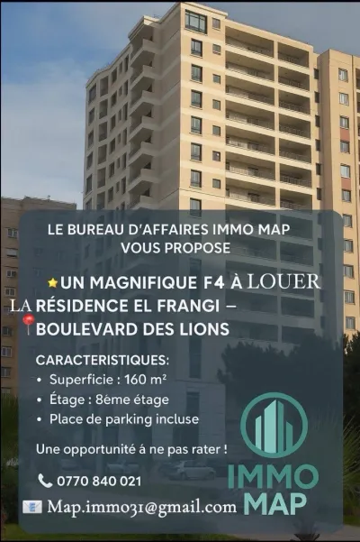 Le bureau d’affaires immo map vous propose ✨ Un magnifique F4 à Louer à la Résidence El Frangi – Boulevard des Lions ✨ Caractéristiques : • Superficie : 160 m² • Étage : 8