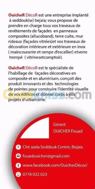 1- Habillage de façades en Alucoband et murs rideaux 2- Rampes d'escaliers et main courantes en INOX 3- vitre en verre trempé 4-Panneaux publicitaires 5- Découpe numérique forex, mdf