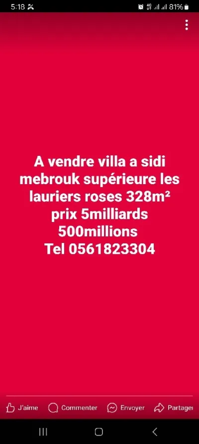 L'agence immobilière darcirta vous propose la vente d'une villa situé à Constantine sidi mebrouk supérieure les lauriers roses Superficie 328m² sous-sol r+2