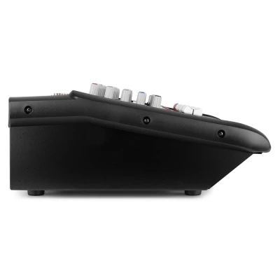 Table de mixage 12 canaux Faders de 60 mm 6 x entrées micro avec alimentation Phantom Filtre coupe-bas 75Hz Compresseurs sur tranche micro 2 entrées ligne stéréo EQ 3 bandes 2 aux