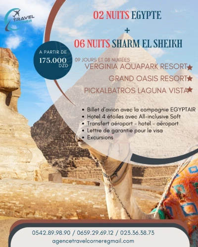 ✓ CAIRE & SHARM EL SHEIKH en JUIN 2025 ✓ 06 Nuits à Sharem El Sheikh / 02 Nuits au Caire ✓ Hôtels ⭐️⭐⭐⭐⭐ au choix ✓ à 175.000 DA ✔️ Le prix comprend : ▪️ Bill