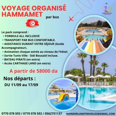 wonderland travel vous propose un voyage organisé a Hammamet mois de septembre PROGRAMME DU VOYAGE : 🔹FORMULE ALL INCLUSIVE 🔹TRANSPORT PAR BUS CONFORTABLE. 🔹ASSISTANCE